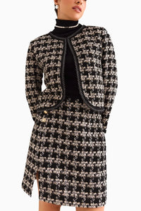 The Black Houndstooth Bouclé Tweed Skirt combines classic sophistication with modern style. Crafted from tweed fabric in a timeless black and white houndstooth pattern, this skirt offers a tailored fit and flattering silhouette.