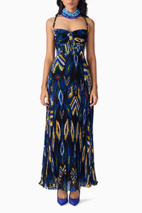 Featuring Black Ikat Kiara Dress by Saaksha & Kinni's Nirah Collection. This stunning maxi dress showcases an Aztec print, delicate hand micro pleats, and adjustable straps, offering a perfect blend of tradition and contemporary elegance.