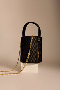 A blend of structure and shine, the Intermesh bucket bag is your perfect plus-one for a night out. A sleek black lamé base is overlaid with a rhinestone mesh exterior, accented with subtle gold hardware and finished with a suede-lined pouch to hold your evening essentials. It’s an accessory that doesn’t just complete the look—it defines it.