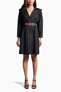 Featuring Black Jacket Dress With Belt by Deepika Arora. A side cut jacket dress with neon flower belt