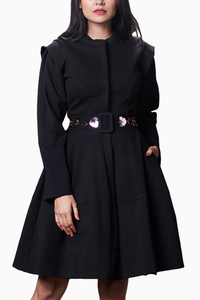 Featuring Black Jacket Dress With Hand Embroidered Belt by Deepika Arora. Crafted from luxurious Ponte Roma fabric, this ensemble blends chic with sophistication. Elevate your style with a hand-embroidered belt, exuding timeless elegance in classic black.
