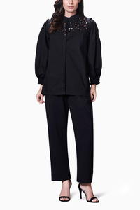 Featuring the Black Jacket Style Co-Ord Set With Hand Embroidered Quilted Yoke by Deepika Arora. Crafted from 100% cotton, this set offers both comfort and style. The hand-embroidered quilted yoke adds a touch of elegance to the classic black ensemble.
