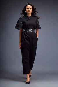 Black jumpsuit with puffed sleeves and textured applique detailing, complemented by dual blue and silver belts.