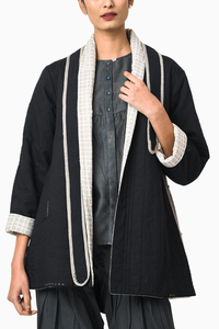 Featuring the Black Kuro Quilted Jacket by Jayati Goenka. This cotton quilted jacket in classic black is exquisitely detailed with signature handwork in golden thread and buttons. Lined with block-printed, natural-dyed cotton, it offers a soft touch against the skin. Complete with a quilted belt for effortless styling.
