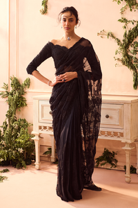 Featuring Black Lace Work Applique Saree with Blouse by Rose Room from it's Hue De Paradise Collection. This saree exudes a captivating blend of timeless elegance and intricate craftsmanship. Crafted from a luxurious fabric like silk or organza, the saree's deep black hue provides a dramatic backdrop for the delicate lace appliques that adorn its surface. Paired with a matching blouse that complements the saree's color and design, the ensemble achieves a harmonious balance.