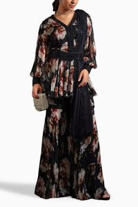 Featuring Black Latifa Printed Kurta Set in Crinkle Chiffon. Hand Embellished in Black Printed hues. Kurta has a front fastening printed with blouson full sleeves, it is backless and has a drawstring. Paired with Sharara, Front belted and back elasticated. Styled with Crinkle Chiffon Embroidered Dupatta, It has an embroidered belt drawstring.