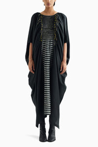 Embrace effortless elegance with our fluid silk black dress, designed to captivate with its exquisite craftsmanship. This free-size dress showcases engineered shibori patterns and intricate pleated details, enhanced by hand-stitched gota and beaded accents that add a touch of refined sparkle. The luxurious silk fabric ensures a flattering fall and a graceful drape, making it an ideal choice for both formal occasions and sophisticated everyday wear. With its striking purple hue and meticulous detailing, this dress offers a perfect blend of contemporary style and timeless beauty.