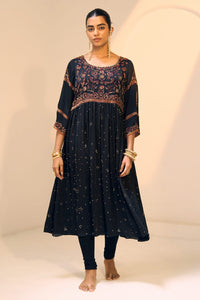 Featuring Black Lavanya Kurta Set by Sarang Kaur from Seerat Collection. This ensembles showcases a striking black embroidered kurta in satin georgette paired with lycra pants, blending traditional craftsmanship with contemporary elegance, ideal for making a stylish statement at any event.