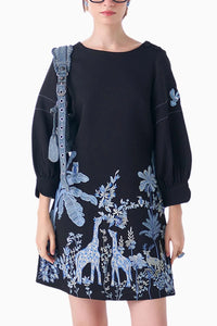Featuring a Banana Crepe Leafora black embroidered dress designed in a flattering A-line silhouette. It showcases jungle-inspired embroidery on the front, with delicate bidding on the sleeves and button detailing on the shoulder for a bold yet elegant finish.