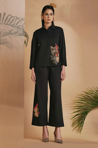 This co- ord set features regular-fit drop-shoulder shirt with front button closure, intricate embroidery on front panel. Paired with full-length straight pants, adorned with delicate embroidery on one side, an elasticated waistband, and a side pocket, this set blends effortless style with modern sophistication.