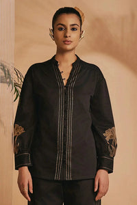 This elegant black shirt, features a loop and button front closure and delicate gathers on the shoulders for a refined touch. The full sleeves with cuff, button, and loop detailing complement the intricate embroidery on the front panels and cuffs, adding artisanal charm.
