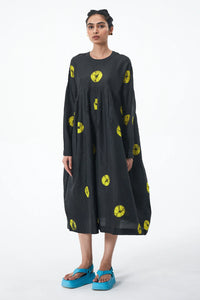 Free size handwoven silk dress with an abstract arrangement of polkas.