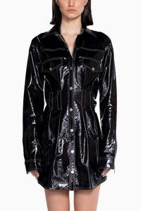 Step into the spotlight with our patent liquid faux leather dress, designed to make a bold statement. Featuring front metal snap closures that add a touch of edgy sophistication, it accentuates your silhouette with a curved corset-like waist. The glossy black hue exudes allure, while each piece may vary slightly in color, adding to its unique appeal. Perfect for those who dare to stand out, this dress is your go-to for commanding attention at any event.