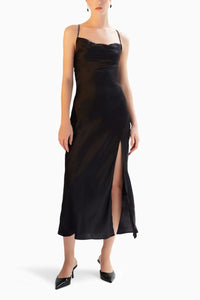 Made from the softest silk satin, the Liza Midi in Black is your go-to slip dress this season. With a luxurious cowl neckline, Swarovski-embellished adjustable straps, and a thigh-high split, this dress exudes elegance. Pair it with a chic jacket for your next evening soiree, and prepare to make a stunning entrance!