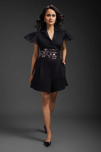 Featuring Black Luminous Playsuit by Deepika Arora. A chic playsuit styled with a statement metallic corset, blending contemporary flair with bold sophistication. Designed to turn heads, itsa standout piece in any modern jumpsuits and playsuits collection.