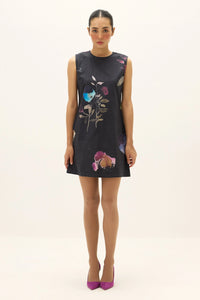 A sleeveless A-line mini dress crafted in Oxford cotton, featuring abstract floral prints in soft bursts of lilac, ochre, and turquoise. Effortlessly structured yet feminine, it transitions seamlessly from daywear to evening edits with minimal styling.