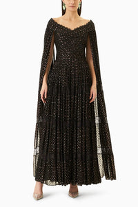 This enchanting black lurex long dress has cape sleeves that add a sexy yet elegant demeanor to the design.