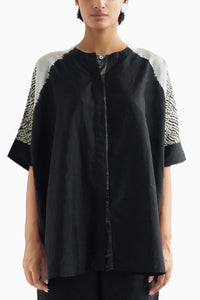 Discover the elegance of our front-open, button-up free-size shibori black shirt, designed to make a sophisticated statement. This versatile shirt features a striking shibori pattern in a deep black hue, with delicate zari embellishments along the placket and detailing, adding a touch of intricate shimmer. The free-size cut ensures a comfortable and flattering fit for various body types, while the button-up design offers a classic and polished look. Ideal for both formal occasions and stylish everyday wear, this shirt seamlessly blends traditional artistry with contemporary flair.