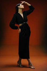 Featuring the Black Matte Crepe Crystal & Bead Embellished Dress from Citara's collection intricate wrap-front detailing with crystal-adorned waist cutouts. Complement with bold heels and a metallic clutch for cocktail nights.