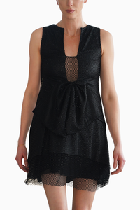 Our black mesh trapeze dress, is crafted with luxurious lamè and mesh. The bow detailing adds a touch of playfulness to the timeless hue.