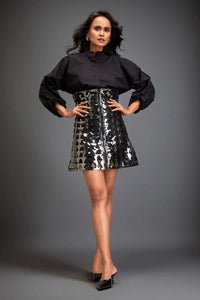Featuring the Black Metallic Cutout Skirt Set from Deepika Arora's Metallic collection, this statement co-ord blends a structured black shirt with a gunmetal metallic mini skirt, detailed with bold triangle cutouts. Made from 100% Cotton and Vegan Leather, it delivers a sleek, true-to-size fit with edgy sophistication.