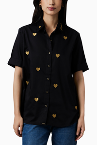 Featuring the Black Metallic Heart Embroidered Shirt by Pallavi Swadi from their Summer Spring 24 collection. This boxy fit shirt includes a classic collar, concealed button placket, half sleeves, and an embellished front collar.
