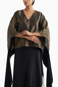 Introducing our signature black kaftan blouse, crafted in handwoven metallic silk. This elegant and stylish piece is a versatile addition to your wardrobe, designed to seamlessly pair with both your existing sarees and our collection. The luxurious metallic silk adds a touch of sophistication and modern flair, making it a standout choice for various occasions. Its refined design ensures it complements a wide range of saree styles, enhancing your ensemble with a chic, contemporary edge.