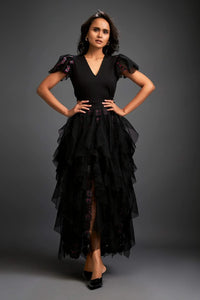 Featuring the Black Metallic Muse Drama Set by Deepika Arora's Metallic collection, this dramatic co-ord showcases a fitted V-neck top with ruffled sleeves adorned in pink metallic embellishments. Paired with a layered cascading sheer skirt and intricate cutwork detailing, it delivers a true-to-size fit with show-stopping flair.