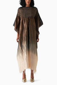 Featuring a free-size striped metallic silk ombre kaftan with our signature shibori neckline, dyed in black