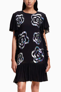 Effortlessly turn heads in our semi-fitted black dress, designed for those who love a blend of edgy and sophisticated. With side ruching and enlarged floral accents, it’s ideal for evening events and girls' nights, guaranteeing you make a memorable impression with its fierce design and unique touches.