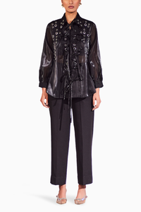 The 3-piece set is a stunning ensemble that exudes elegance. The oversized shirt in organza features tie detailing and rivets, adding a touch of glamour and style to the outfit. Inside, the bustier complements the overall look beautifully. Paired with the wide-leg pants, this set creates a chic and fashion-forward silhouette that is perfect for special occasions or events.