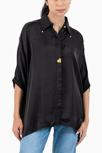 Featuring Black Moondust Shirt by URAIB from The Forest Affair Collection. This whimsical embellished classic collar shirt in silk showcases collar detailing, and a concealed button placket.