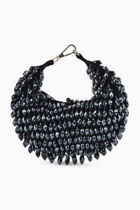 The Nano Boat Bag exemplifies meticulous craftsmanship with its exquisite design, featuring a detailed arrangement of stone and crystal beads that radiate opulence and charm. The all-over stone work enhances its glamorous appeal, ensuring it stands out as a distinctive accessory for any special occasion. Handcrafted with genuine artistry, this bag is available in classic black hues, adding a touch of sophistication to your ensemble.
