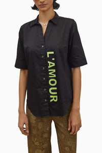 The perfect symmetry of needlework meets alluring Parisien charm in this newest arrival to our L'Amour collection. In the eternally loved hue of black comes another L'amour embroidered shirt in a beautiful shade of neon green. This shirt is relaxed, charming, flawlessly tailored.