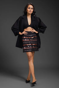 Featuring Black Neon Metallic Skirt by Deepika Arora. A chic skirt featuring bold neon metallic detailing, designed to elevate your look with a modern, vibrant edge. Perfect for making a statement at any stylish event or casual outing.