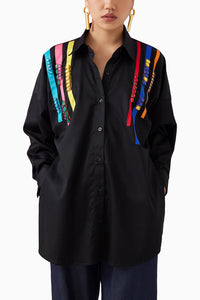 The Night Sky Embroidered Box Shirt is crafted from Studio Rigu's stunning Poplin fabrication. Made in our stunning tape and Swarovski Embroidery Detail this is a trend setting piece. Featuring a Boxy oversized shirt with full sleeves, this piece is versatile and easy to wear. It has a Regular collar and is paired with our Rover Topstitching Trousers. Pair it with heels for an elegant look