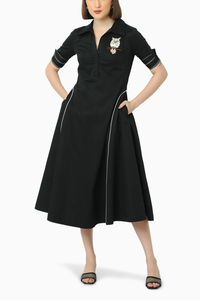 Discover the perfect blend of comfort and style with our Black Cotton Satin Shirt Dress, featuring a charming hand-embroidered owl applique. Crafted from soft cotton satin, this relaxed-fit dress showcases intricate stitch details on the cuffs, along with convenient side pockets and a sleek side zipper. Effortlessly chic, it’s ideal for any occasion where you want to make a statement.