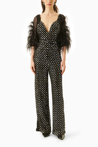 Nite Black Color Jumpsuit With Hand Applique Faux Leather Laser Cut Detail, Sleeves Are Highlighted With Bugle Beads, Feathers & Sequin.
