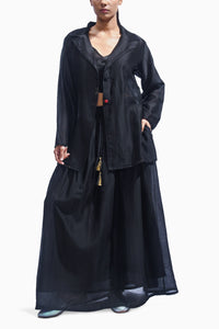 An all-black ensemble in cotton silk — featuring a fitted bralette, an easy silk blazer, and a fluid long skirt. The look blends structure and softness, offering effortless elegance with contemporary restraint. Each piece is finished with our signature handwork of button and cross with golden zari, lending a touch of artisanal shimmer to the monochrome palette.