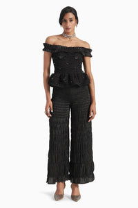 Black Off-Shoulder Peplum Top with Scale Smocked Wide-Leg Pants features a ruffled, off-shoulder silhouette with intricate wave hand-smocking and tonal pearl embroidery. Paired with comfortable wide-leg pants showcasing signature hand-smocked texture, creating a statement look that balances structure with fluid ease.