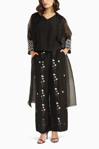 Black Organza Jacket with Embroidered Sleeves and Printed Flared Pants