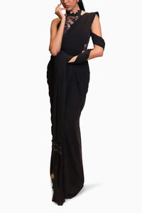 Unleash your bold and elegant side with this Black Pre-Draped Saree, styled with a dramatic sheer halter neck blouse. Featuring hand-embroidered lace and intricate beadwork, the blouse adds a touch of sensual sophistication. The attached saree drape is fluid and flattering, offering a ready-to-wear solution for high-glam events. Finished with glove-style sleeves and a beaded fringe detail at the pallu’s edge, this piece is a statement in itself—perfect for fashion-forward evenings.