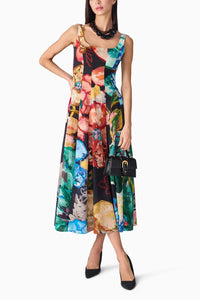 Featuring Black Prime Emily Dress by Saaksha & Kinni's Nirah Collection. This elegant midi dress showcases a vibrant floral print, a flattering square neckline, a fitted bodice, and a flared silhouette, blending timeless charm with modern sophistication.