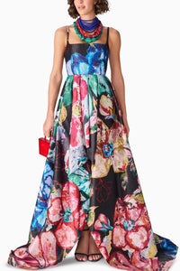 Featuring Black Prime Evelyn Dress by Saaksha & Kinni's Nirah Collection. This elegant gown showcases a floral print, a sophisticated square neckline, an asymmetric silhouette, and a flowing trail, exuding timeless grace with a contemporary edge.