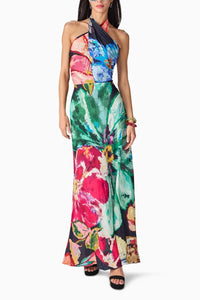 Featuring the Black Prime Shailee Dress by Saaksha & Kinni's Nirah Collection. This elegant column dress showcases a floral print with a sophisticated halter neckline, offering a sleek and timeless silhouette.