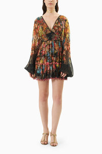 Crafted in lurex georgette fabric this black printed short dress is framed with a deep v-neckline which meets at the smocked elasticated waist and features balloon sleeves with an elastic cuff to create a flattering feminine silhouette.