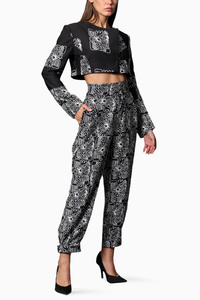 Featuring Black Printed Crop Jacket With Chinos Pants by Swatee Singh. Elevate your style in black heavy crepe. This set has a relaxed fit, full straight sleeves, and chic chinos, redefines contemporary elegance.