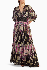 Featuring the Black Printed Kaftan from Roseroom's Spring 2024 Collection. This chic kaftan, crafted from viscose georgette jacquard, highlights a captivating black and magenta print. It boasts scalloped lace detailing at the neck and bottom, with an embroidered patch on the waist.