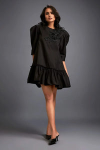 A dramatic ensemble featuring ruffled puffed sleeves and a voluminous skirt, adorned with intricate black Swarovski-beaded floral applique detailing, creating a bold and striking look.