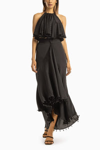 A maxi skirt that flares at the bottom with a shorter front and a longer back. Wraps around the waist and closes with a hook. The hem is hand embellished with drop crystals. Cut from satin, the sheen of the fabric makes it a great option as a lighter lehenga.